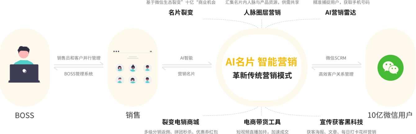 通過名片傳播、裂變商城、短視頻、直播等多類型營銷模式形成裂變傳播,智能獲客。